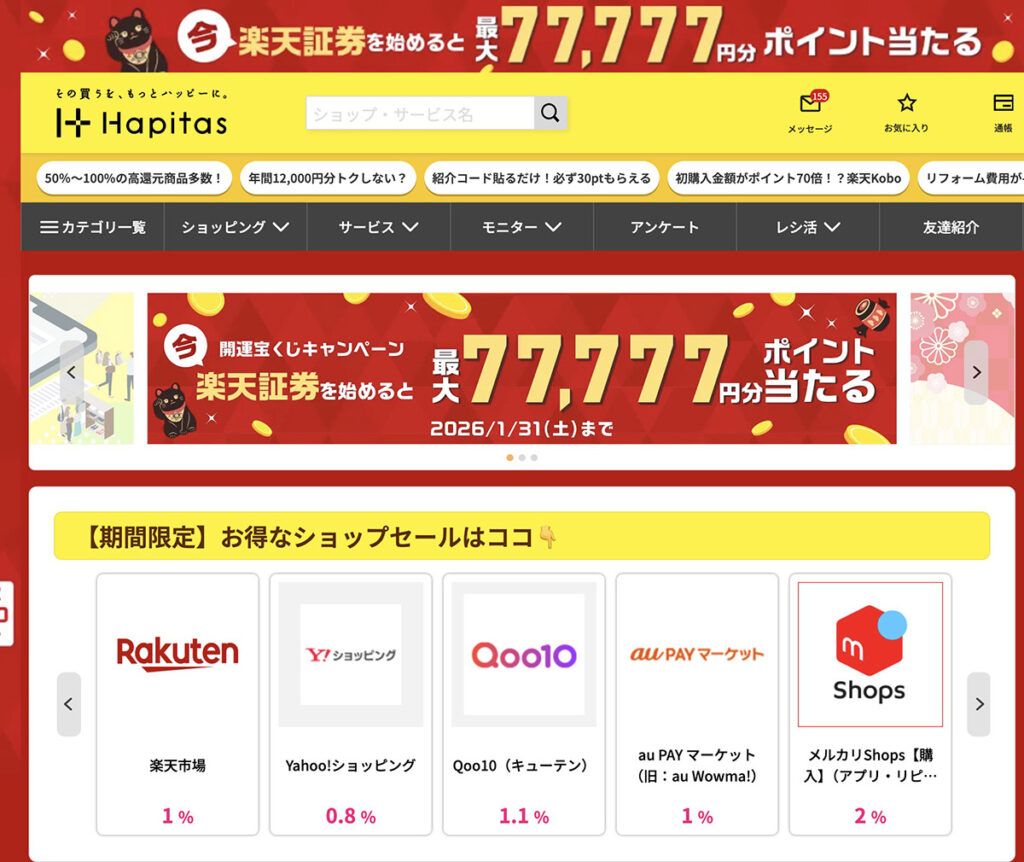 また、ハピタスは広告案件の還元率が業界トップクラスに高く設定されており、特にネットショッピングやクレジットカード発行で効率よくポイントを稼げるのが魅力になっています。サイトのデザインもシンプルで分かりやすく、ゲームやアンケートなどの「コツコツ系」コンテンツは少なめです。