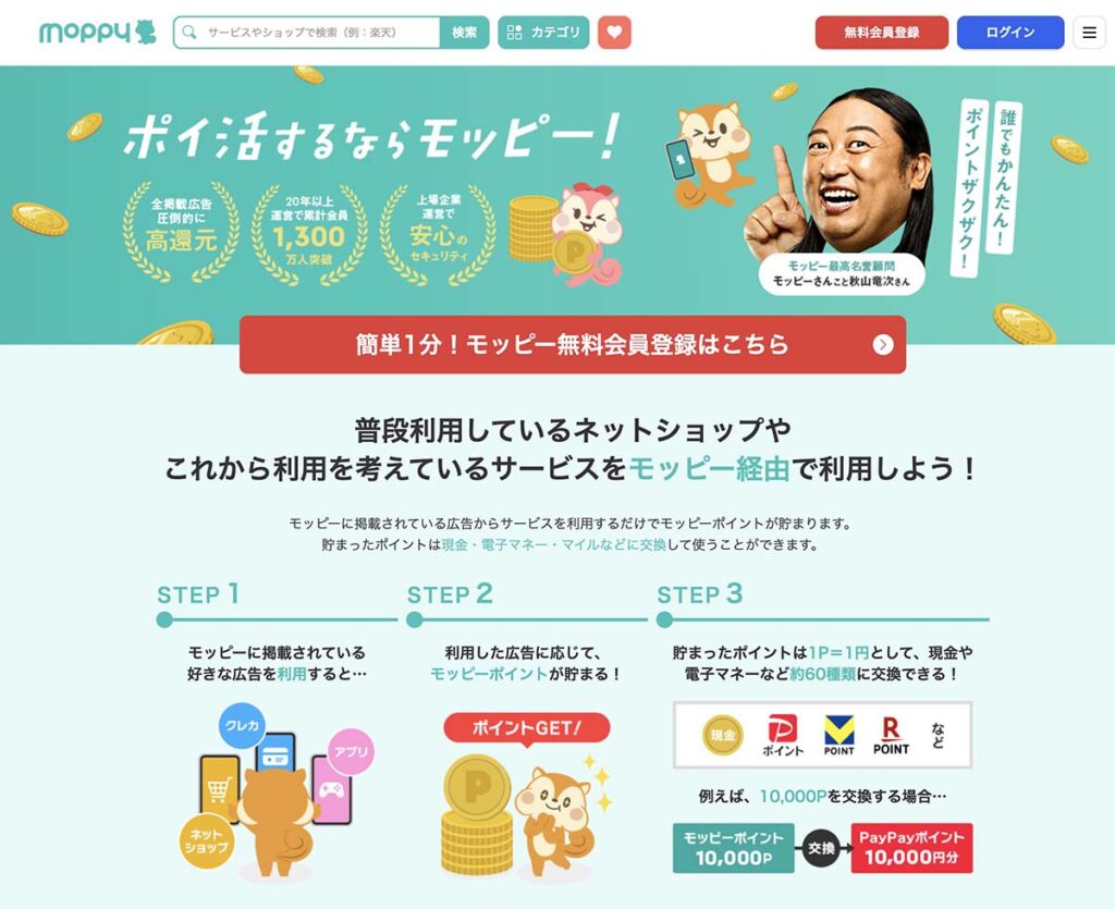そんな疑問や不安を持つ方に、自信を持っておすすめできるのが「モッピー」です。モッピーは累計会員数1,300万人を突破した国内最大級のポイントサイトです。